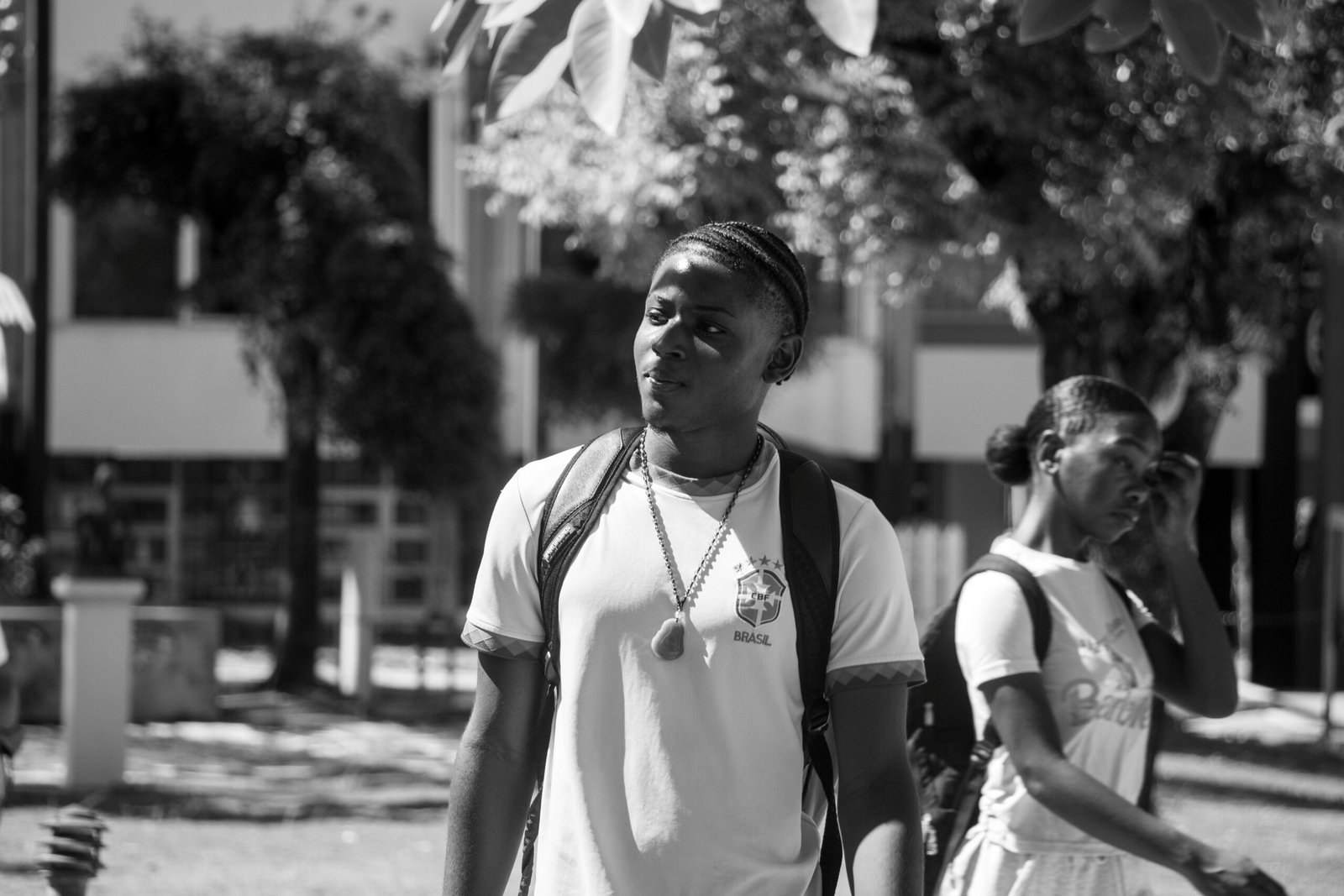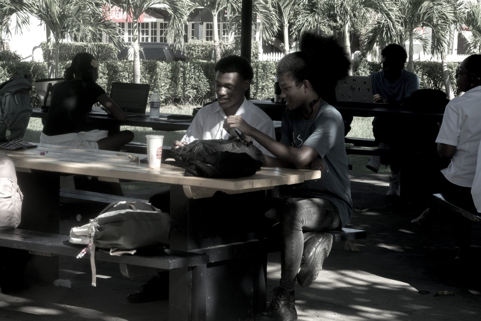 Two students having a chat at UTech's sculpture park.